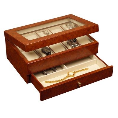 0068111 Burlwood oak finished watch box Features: -Glass viewing window.-Ten padded watch cushions on top.-Drawer with three sections.-Gold-tone drawer pull.-Hand lined ivory sueded fabric interior. Color/Finish: -Burlwood Oak finish. Dimensions: -Overall dimensions: 4.75'' H x 11.63'' W x 7.75'' D. Oak finish Clear viewing window for display Ten padded watch cushions on top Drawer with three sec